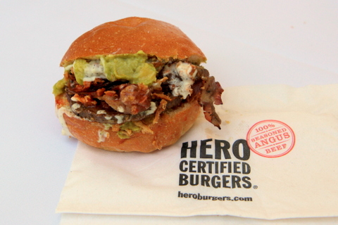 | HERO CERTIFIED BURGERS The Action Hero: Angus beef patty, guacamole, bacon, chili white cheddar, onion ring, tomato, lettuce, and Hero sauce. | Look for it as a future feature item |