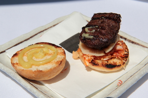 | UTOPIA CAFÉ AND GRILL Korean short rib burger topped with kimchi slaw, pickled daikon, and spicy karashi mayo | Look for it on a future menu |