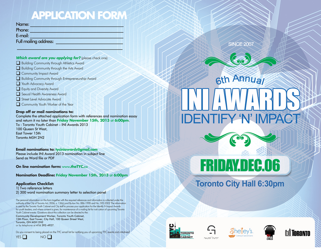 The 6th Annual INI AwardsThe Toronto Youth Cabinet (TYC) and the City of Toronto are accepting applications for the 6th annual Identify ‘N’ Impact (INI) Awards. These awards celebrate the contributions of young people throughout Toronto and value their roles as advocates, visionaries, and agents of social change.  The awards are open to youth (13-24) or youth-led organizations that focus on servicing young people within the city of Toronto. All applicants must demonstrate that they are positive role models for youth and have made an impact in the community.